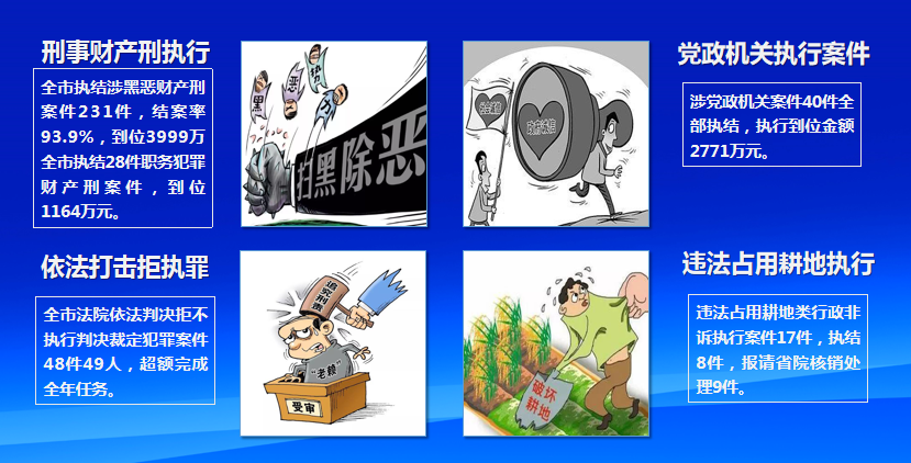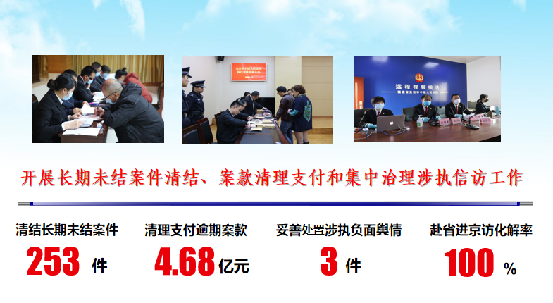 泉州两级法院坚持“服务大局、统筹兼顾、软硬结合”工作原则,积极巩固发挥原有优势,突出依法公正规范,打造高效精准、打击有力的执行平台,努力提升执行绩效和威慑力;强化善意文明理念,制订落实“六保六稳”政策的执行措施,努力优化服务营商环境。全市法院推广学习石狮法院的执行工作经验,首执案件结案平均用时同比下降36%;试行“云执行”与线下执行相结合的“三分法”,在全省率先与辖区内所有动车站派出所建立协作留置被执行人工作机制,共协助拘留被执行人3000余人,达成和解或自动履行案件比例达53%;自主研发易判智能执行管理系统;共清理失信被执行人11.33万人次,清理量居全省首位。晋江法院首创打造“一十百千万”帮扶工程,得到最高法院周强院长批示肯定。