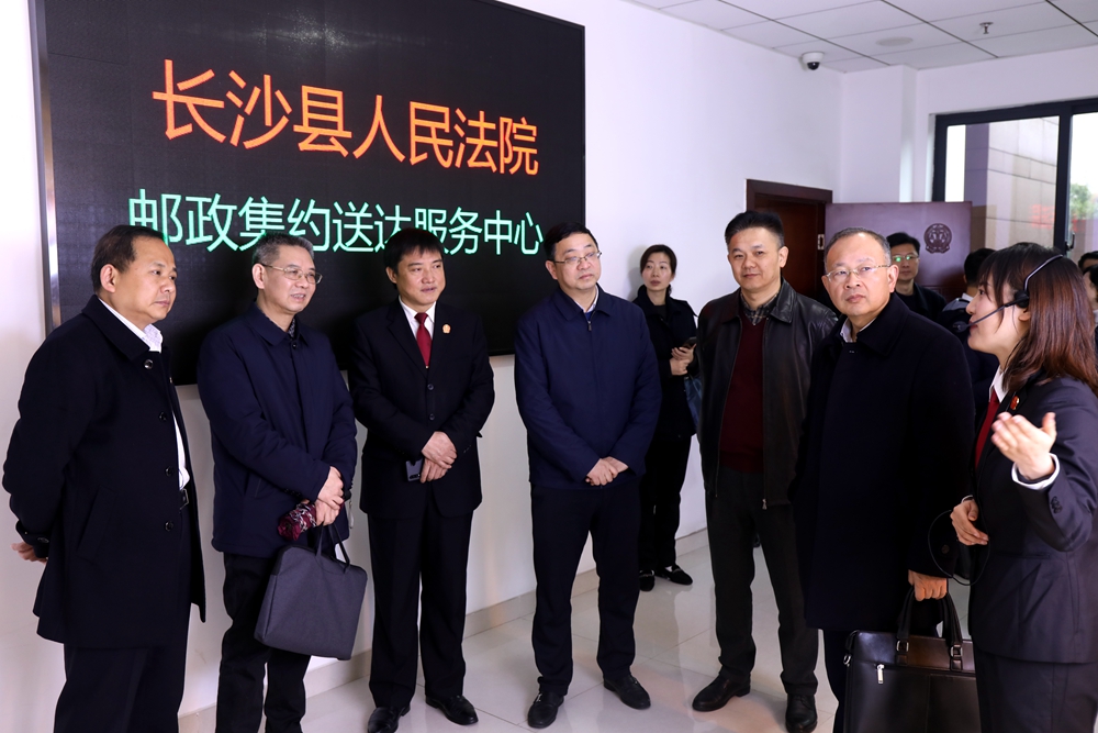彭晓春处长一行实地查看了长沙县法院诉讼服务中心、立案服务大厅等“一站式”多元解纷诉讼服务场所,在立案大厅亲身体验了县法院智能化诉讼服务给人民群众带来的快捷便利,在邮政集约送达服务中心详细询问了送达工作开展情况。