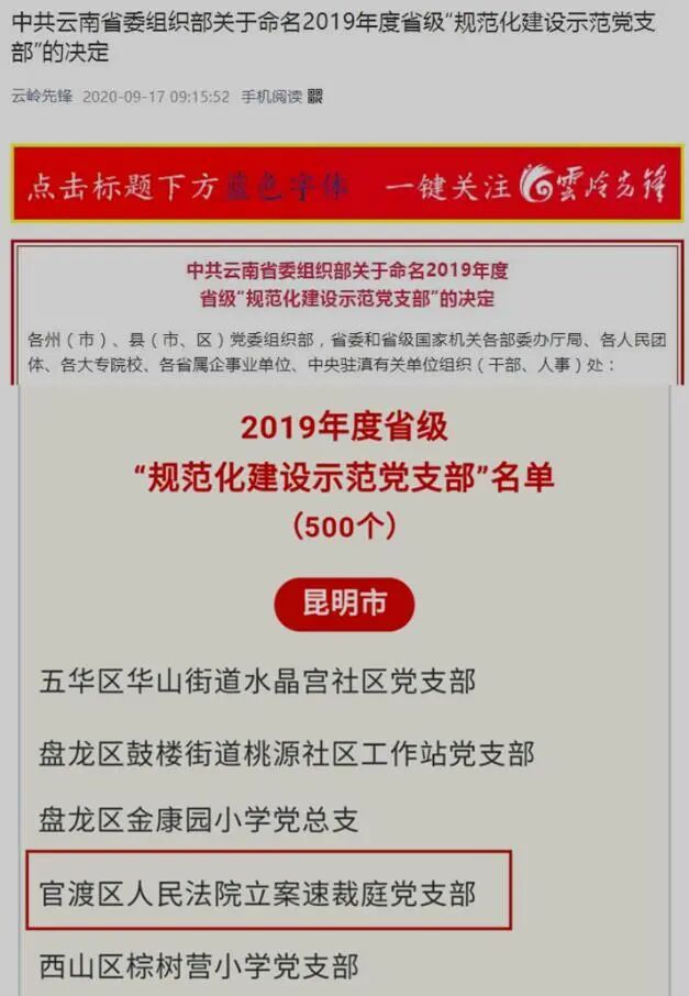 立案速裁庭党支部由“全国法院指导人民调解工作先进个人”“昆明市劳动模范”、获“2019年度云南十大法治新闻人物”提名奖的蔡家瑶担任支部书记。她带领速裁团队,人均结案1000件以上,以占全院10%的员额法官办理了全院60%的民商事案件,成为全省、全市法院简审速裁工作的先进典型代表。30余年坚守审判岗位的银发党员代表李曰福,年均办案千件,探索出独有“调解九法”解民忧;执行局党支部法官郭虹,参评基层最暖心干警,仅2018年共结案875件,结案标的1.39亿元;还有全国维护妇女儿童权益先进集体关上支部书记赵梦、执行“尖兵”申正鑫、敢于探索创新代表曾惠祥……一名名党员以实干为基、以创新为魂、以和谐为本,在执法办案、多元解纷、矛盾化解、疫情防控、脱贫攻坚等工作中作表率当先锋,为推动官渡法院“四个一流”目标筑牢根基,凝聚起跨越发展新优势的智慧力量,以新担当新作为焕发出“东骧神骏护法安天下,古渡渔灯映德润人心”的法治光华。