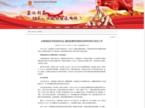 2020年2月26日,云南省高级人民法院召开新闻发布会,向社会公众通报在疫情防控期间,云南法院如何用好用足智慧法院建设成果全力保障法院审判执行工作高位推进,做到疫情防控和法院工作两手抓两不误的相关情况。