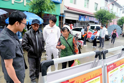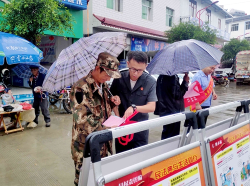 早上7点多,小雨,腰街乡赶集日的集市已熙熙攘攘,干警们来到“黄金地段”,一边布置宣传摊位,一边向围观和过往群众发放宣传材料,讲解介绍民法典内容。