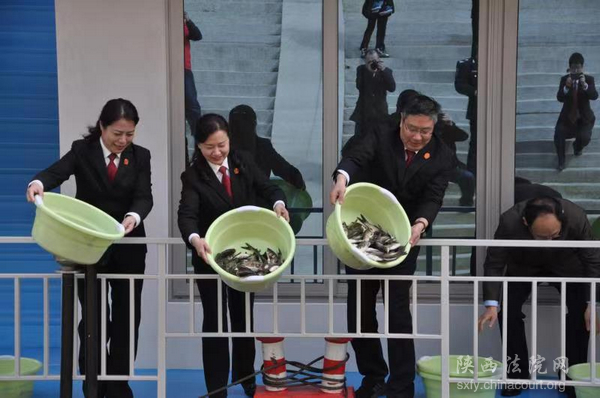 陕西法院网讯 3月11日,安康铁路运输法院在安康市汉江赢湖库区举行长江流域重点水域“十年禁渔”司法放流活动。下午3点40分,随着西安铁路运输中级法院党组书记 、高波院长宣布司法放流活动正式开始,在参加放流活动的工作人员的见证和安康市公证处公证员的监督下,35000余尾鱼苗缓缓被放流进入瀛湖水域。