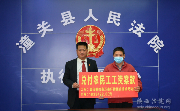 陕西法院网讯 近日,湖北籍农民工王某东从潼关法院执行工作局领回被拖欠长达四、五年之久的183万余元工资,解决了几十个农民工的燃眉之急。