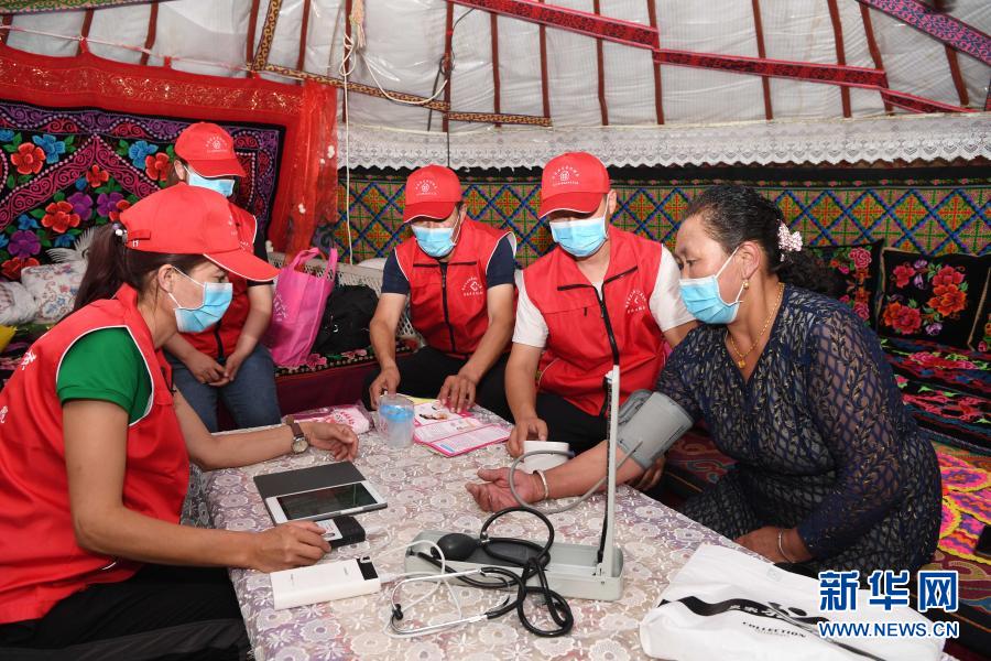 新疆阿勒泰地区布尔津县也格孜托别乡卫生院医生在给牧民检查身体(2020年6月20日摄)。新华社记者沙达提摄