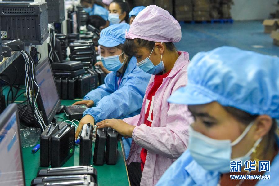 在位于新疆策勒县天津工业园内的智能制造产业园,工人在流水线上忙碌(2020年11月4日摄)。新华社记者丁磊摄