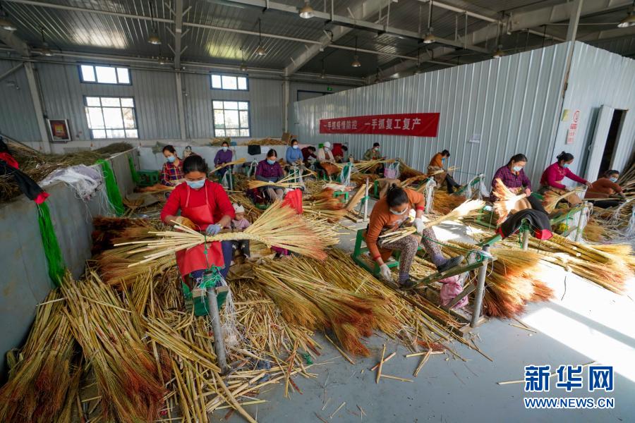在新疆和田地区墨玉县阿克萨拉依乡乌尊艾日克村,当地村民在佳美扫把制作中心制作扫把(2020年10月22日摄)。新华社记者赵戈摄