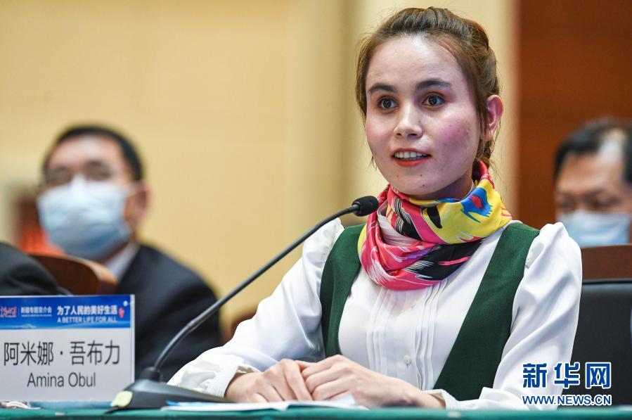 2月22日,在新疆专题宣介会现场,在新疆昌吉市一家企业工作的阿米娜·吾布力分享自己的故事。新华社记者王菲摄