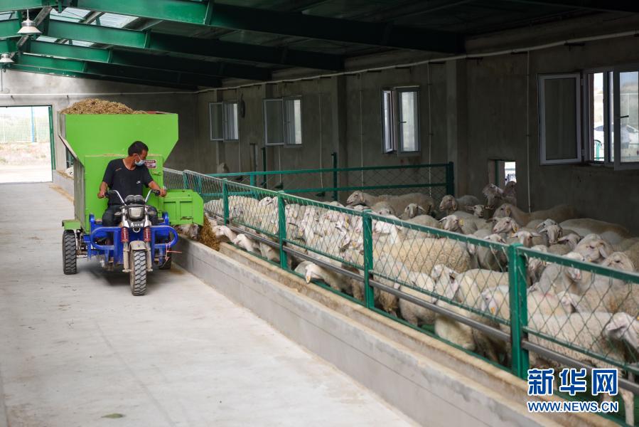 在新疆尉犁县古勒巴格乡标准化养殖场,工作人员驾驶电动撒料车喂羊(2020年8月25日摄)。新华社记者丁磊摄