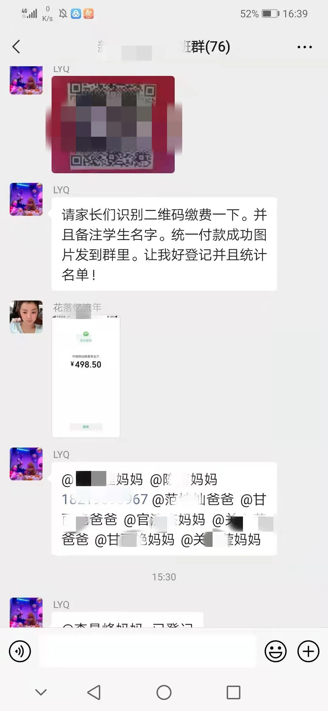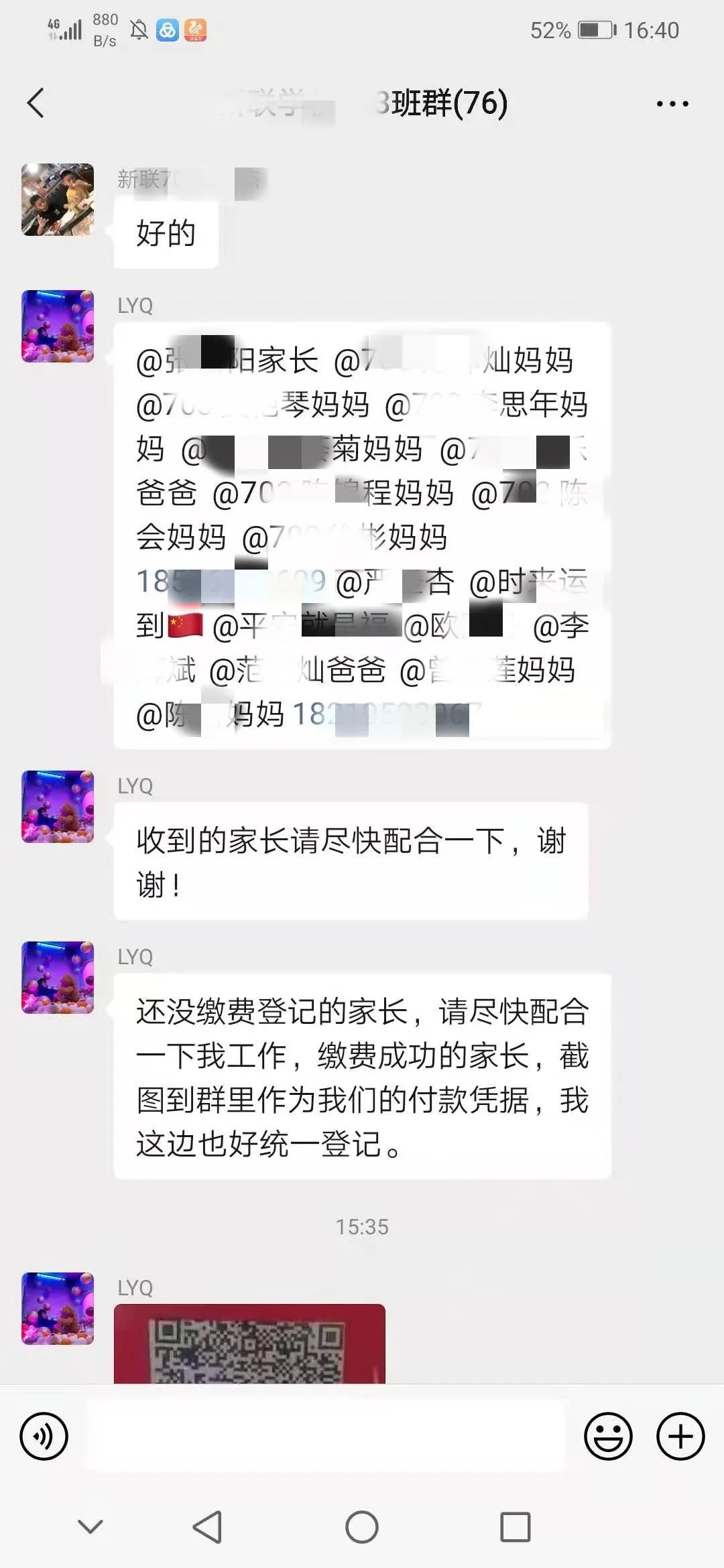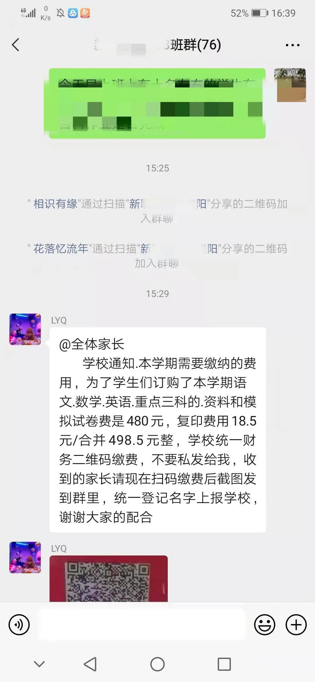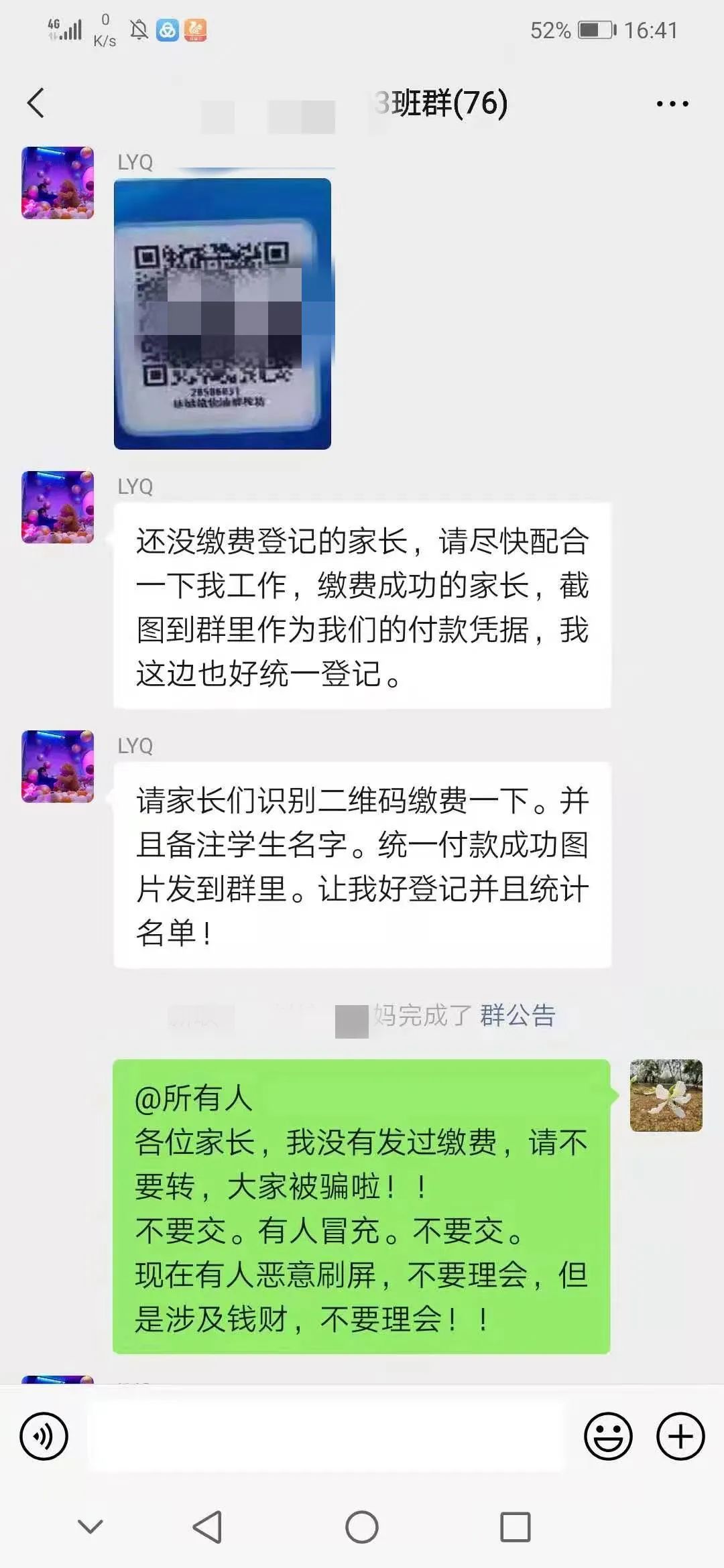 事后,经了解得知班上一名同学受到诈骗分子的诱骗,将班级微信群二维码提供给了诈骗分子。事发当日,2名诈骗分子通过扫描二维码进入班级微信群,趁着班级正在上课老师们无暇顾及群内消息之时,冒充班主任及家长在群内发出收缴教材费的通知,同时不断催促家长们尽快缴费导致群内2名家长上当受骗。