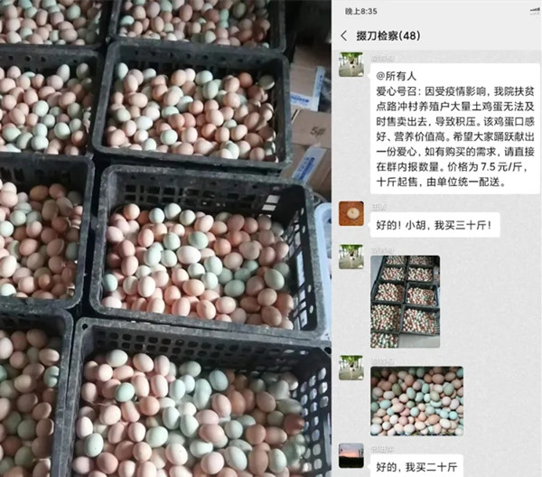 疫情期间,养殖户家中2000斤鸡蛋滞销,村民焦急万分。该院得知消息后组建了党员助农服务队,建立微信销售群,广大党员干警积极推介宣传,市民纷纷联系购买,疫情期间卖菜难、买菜难的“烦恼”迎刃而解。