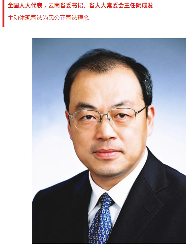 3月9日下午,十三届全国人大四次会议云南代表团审议“两高”工作报告。全国人大代表,云南省委书记、省人大常委会主任阮成发说,“最高人民法院和最高人民检察院工作报告,坚持以习近平新时代中国特色社会主义思想为指导,全面贯彻习近平法治思想,生动体现了司法为民、公正司法的工作理念,集中展现了社会主义法治建设的实践成果,我完全赞同。”