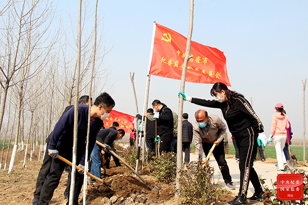 纪检监察干部不仅是政治生态的“护林员”,更是“绿水青山就是金山银山”理念的忠实践行者。山东省高密市纪委监委机关党支部开展共植“清风树”活动,携手共建绿色凤城。图为该市纪检监察干部在柴沟镇郝家村义务植树。(山东省高密市纪委监委 谭炳辉 摄)