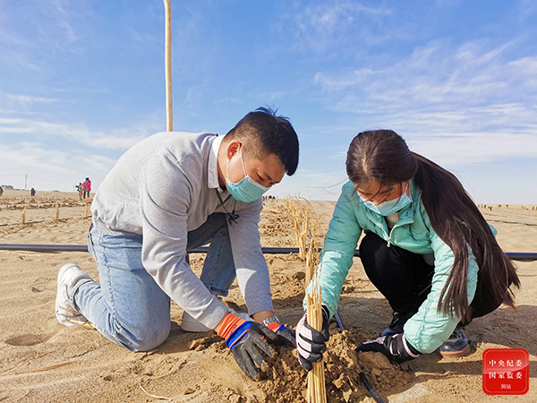 寒意未退尽,植树正当时。新疆维吾尔自治区巴州且末县纪委监委组织干部来到与县城仅有一河之隔的塔克拉玛干大沙漠,以实际行动建设绿色家园,改善生态环境。(新疆维吾尔自治区巴州且末县纪委监委 迪力夏提·多力昆 摄)