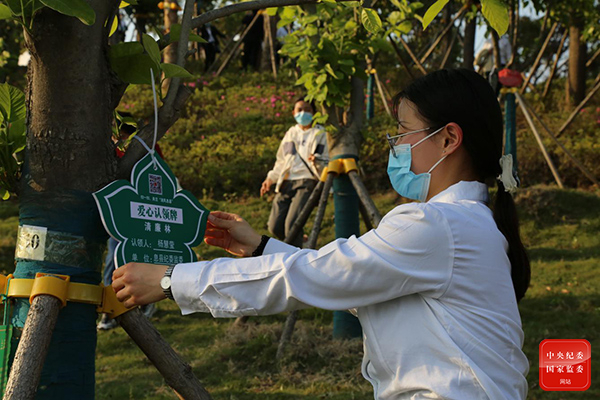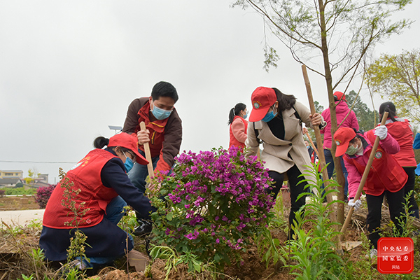 绿水青山,就是金山银山;前人植树,造福后人。在春耕时节,贵州省贵阳市修文县纪检监察干部系上“绿丝带”参加一年一度的植树活动,众人植树树成林,齐心协力共同打造绿色生态环境。(贵州省贵阳市修文县纪委监委 李佳欣 摄)