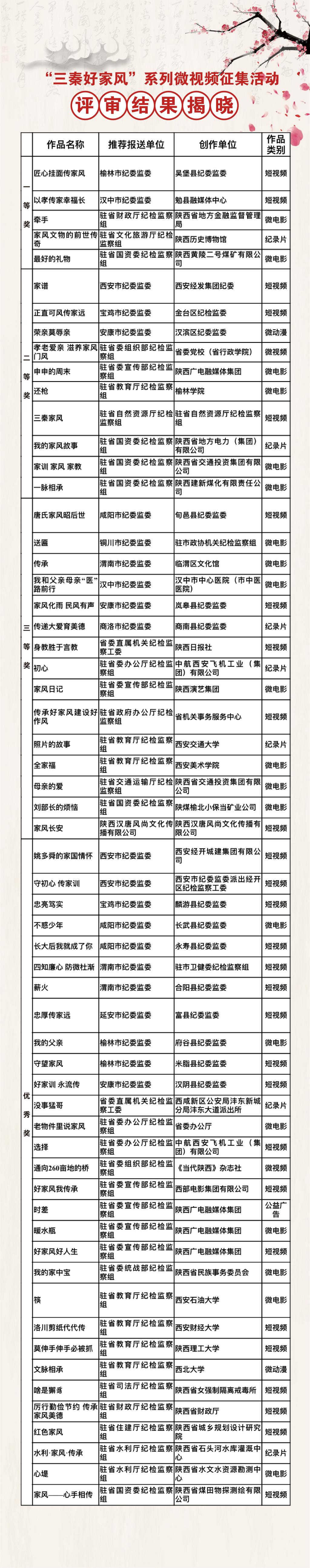 为深入贯彻习近平总书记关于“家庭家教家风建设”的重要论述,省纪委监委开展了“三秦好家风”系列微视频征集展播活动。活动开展以来,各市纪委监委、省纪委监委各派驻(出)机构认真组织实施,精心创作作品应征,国企、高校和社会各界积极参与,累计收到各类微视频作品273部,作品总时长26小时。