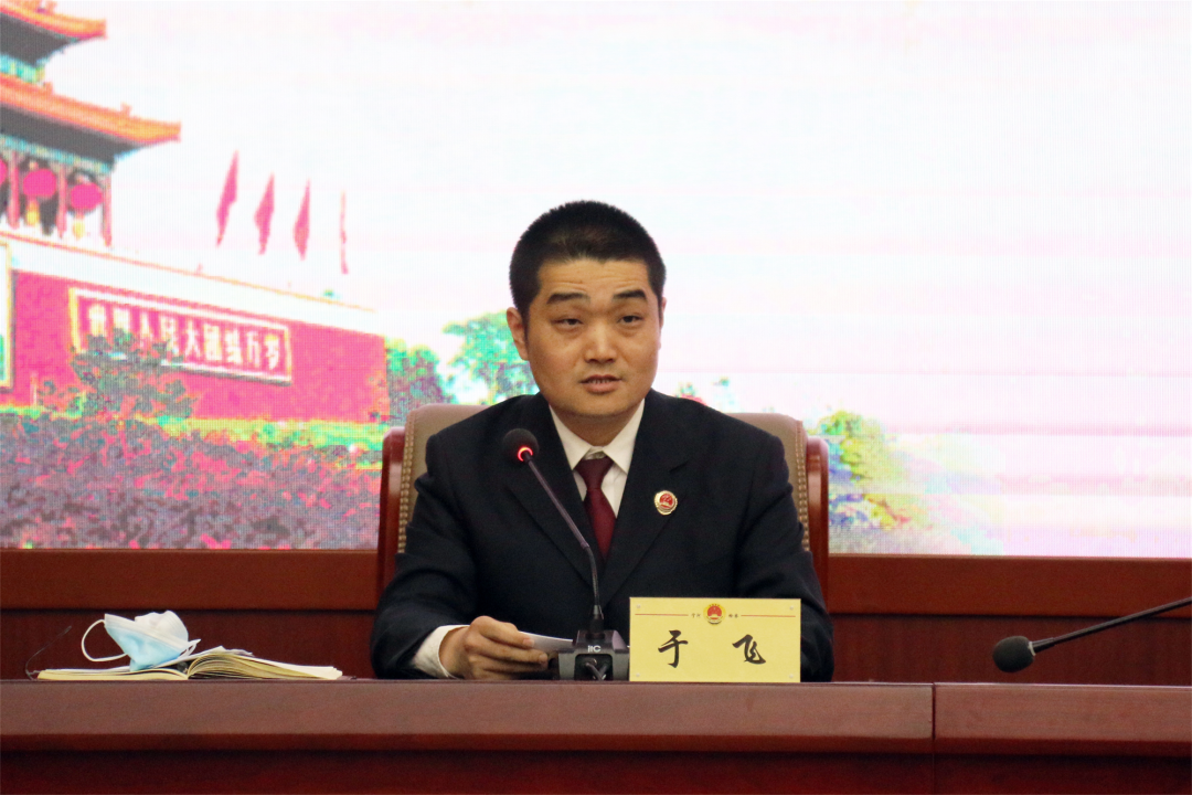 党组成员、政治部主任于飞传达中央、市委、区委在党史学习教育动员大会上的讲话精神。