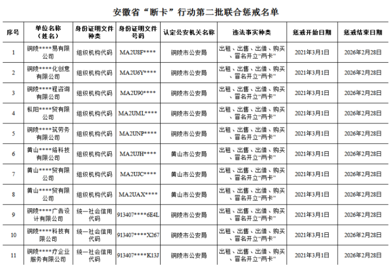 为严厉打击整治非法开办贩卖手机卡、银行卡违法犯罪,坚决遏制电信网络诈骗犯罪的高发态势,切实维护社会治安大局稳定,安徽省打击治理电信网络新型违法犯罪工作联席会议办公室公布“断卡”行动第二批联合惩戒名单。