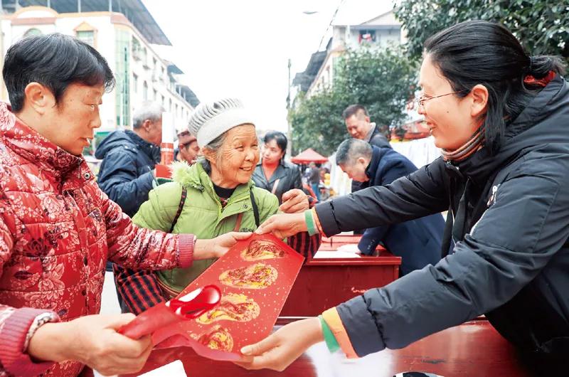 图片四川省华蓥市委依法治市办公室和市老年法治宣讲团、关心下一代工作委员会,联合组织法治宣传志愿者,利用群众较集中的赶场日巡回到各乡镇,通过法治书法作品展、为群众义务书写法治对联、赠送法治年画等形式,宣传法治知识,让在寒冬中的山区群众感受法治文化带来的温暖。图为2020年12月1日,在第七个国家宪法日来临之际,四川省华蓥市法治文化宣传志愿者在高兴镇为赶场的群众赠送对联。人民图片 邱海鹰/摄