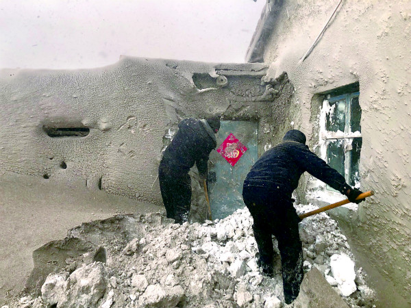 图②:由于张金英家处于窝风地带,屋门被厚厚的积雪堵住。