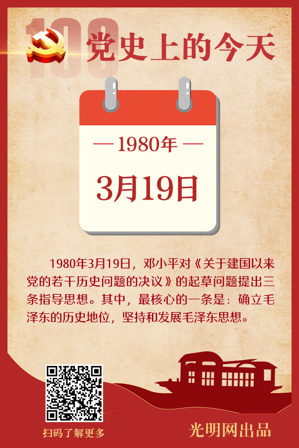 3月19日 邓小平在同中央负责同志谈《关于建国以来党的若干历史问题的决议》稿起草问题时指出,中心的意思应该是三条。第一,确立毛泽东的历史地位,坚持和发展毛泽东思想。这是最核心的一条。第二,对建国30年来历史上的大事,要进行实事求是的分析,包括一些负责同志的功过是非,要做出公正的评价。第三,对过去的事情做个基本的总结。其中最重要、最根本、最关键的,还是第一条。