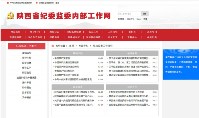 近日,为进一步深化县镇纪检监察机关“三化”建设,推进企业、高校纪检监察工作规范化建设,省纪委监委在陕西纪检监察内网开通了《纪检监察工作指引》专栏。