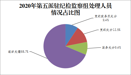 2020年,拉萨市纪委监委第五派驻纪检监察组共受理问题线索42件,处置30件,移送3件,初核了结8件,函询了结2件,了结6件,立案11件,处理32人,其中给予党纪政务双处分 3人(开除党籍开除公职1人,留党察看1年、政务撤职按二级警员安排工作1人,党内警告、政务警告1人),给予党纪处分4人(党内严重警告3人,党内警告1人),给予政务处分3人(政务记大过2人,政务警告1人),组织处理22人(开除公职1人,解除劳动合同1人、诫勉谈话8人,约谈7人,批评教育2人,谈话提醒2人,提醒谈话1人)。