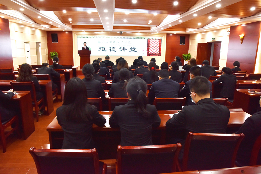湖南法院网讯 弘扬英模精神,践行使命担当。3月18日下午,岳阳市中级人民法院结合政法队伍教育整顿、践行社会主义核心价值观,专题举办英模精神宣讲“道德讲堂”。省级驻点第六指导组法院现场指导专班有关领导到场指导,来自各内设机构的40余名青年干警参加活动。