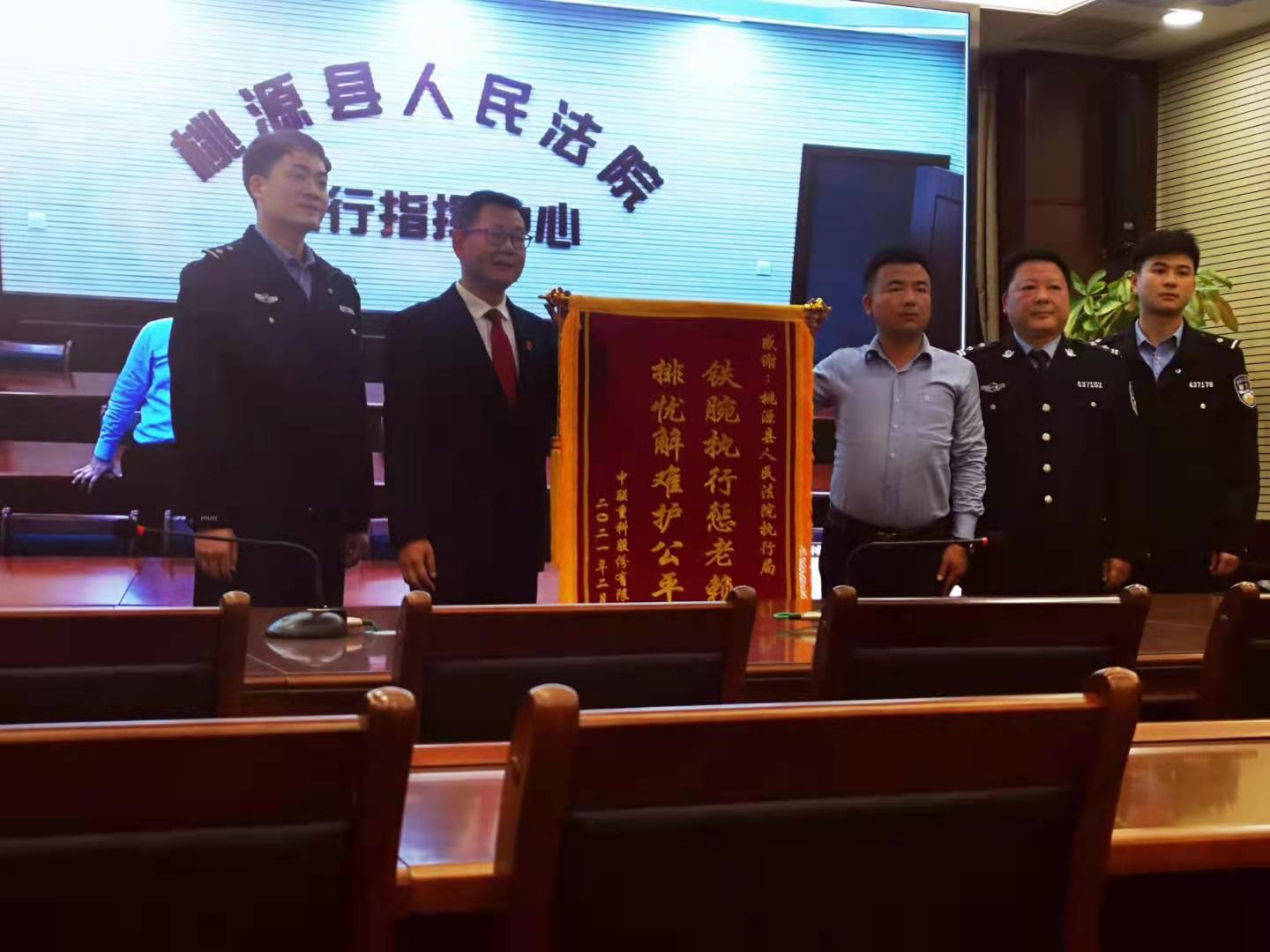 湖南法院网讯 近日,桃源县人民法院执行局收到了一面“铁腕执行惩老赖,排忧解难护公平”的锦旗,这是由申请执行人中联重科融资租赁(中国)有限责任公司负责人送来的,以此表达谢意。