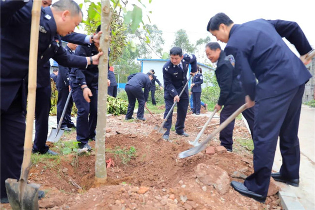 同一时间,港北公安分局、港南公安分局、交警支队分别在震华村谭岭屯、大岭屯、六湖屯开展为烈士故乡义务植树活动。