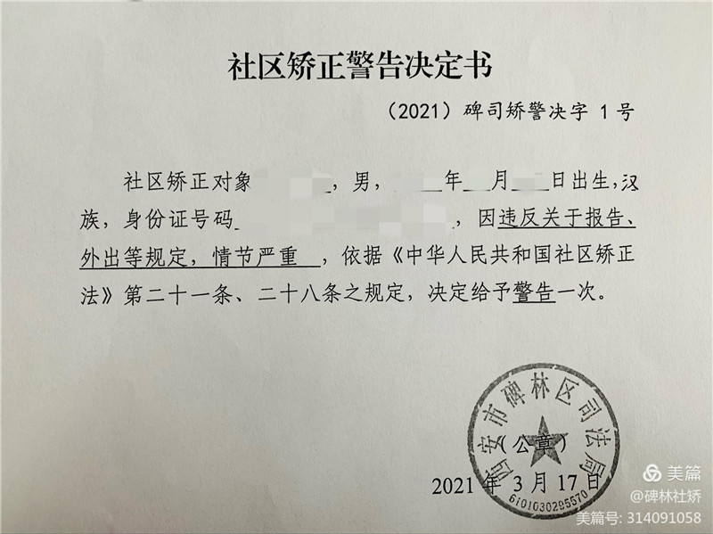 碑林区司法局联合监狱选派民警对赵某进行了训诫谈话,向赵某亮黄牌以示警醒,并给予书面警告。工作人员告诫赵某要牢固树立身份意识和认罪悔罪意识,修心持戒,杜绝重新违法犯罪,安全度过社区矫正期。
