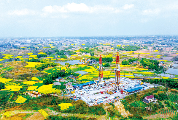 图②:在我国首个深层页岩气田——中国石化威荣页岩气田,钻井铁塔矗立在五彩大地上。王平 摄