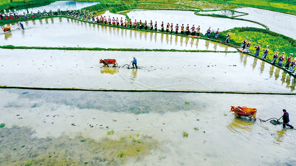 图①:近日,苗族同胞在贵州省丹寨县龙泉镇卡拉村的梯田里耕作。新华社记者 欧东衢 摄