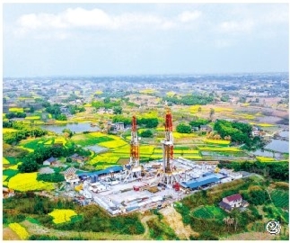 图②:在我国首个深层页岩气田——中国石化威荣页岩气田,钻井铁塔矗立在五彩大地上。王平 摄