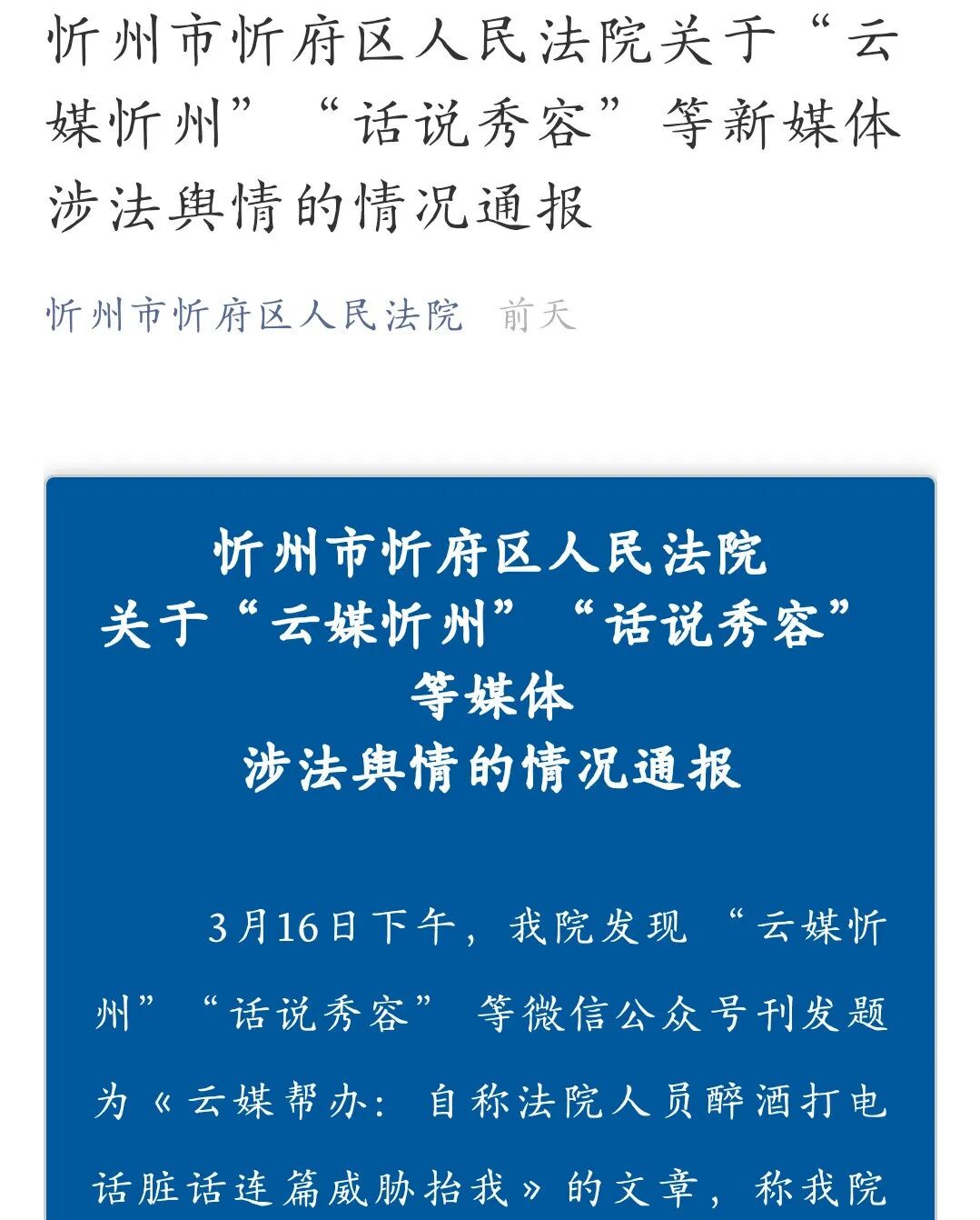3月21日,忻州市忻府区人民法院发布一则《关于“云媒忻州”“话说秀容”等新媒体涉法舆情的情况通报》。