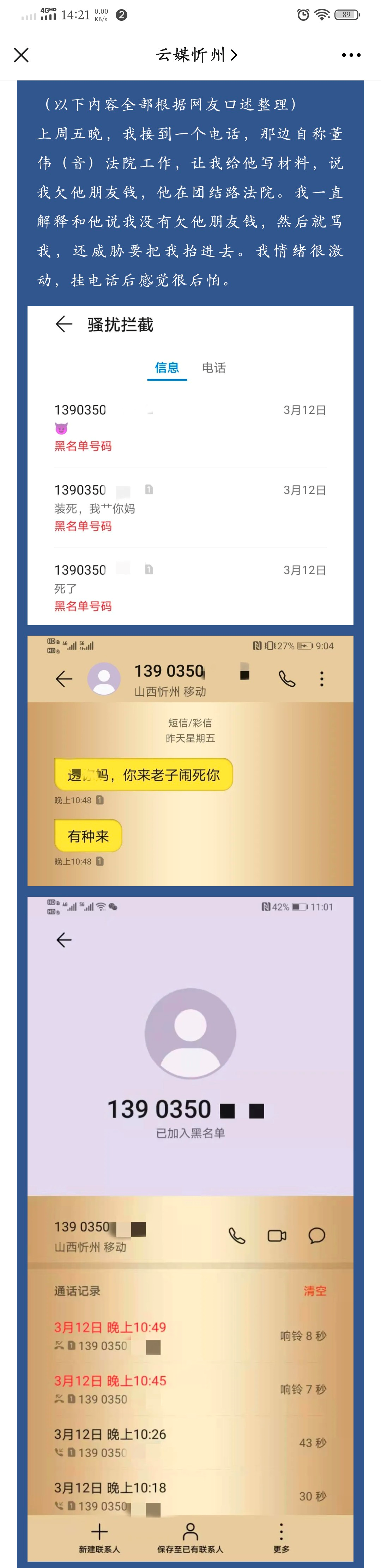 通报称,3月16日下午,我院发现 “云媒忻州”“话说秀容” 等微信公众号刊发题为《云媒帮办:自称法院人员醉酒打电话脏话连篇威胁抬我》的文章,称我院工作人员违规介入经济纠纷,对群众存在辱骂、威胁情形,并附有电话录音。