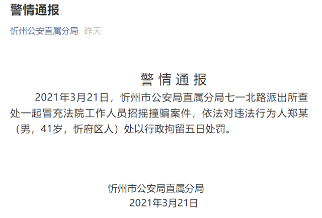 通报称,3月21日,该局七一北路派出所查处一起冒充法院工作人员招摇撞骗案件,依法对违法行为人郑某(男,41岁,忻府区人)处以行政拘留五日处罚。