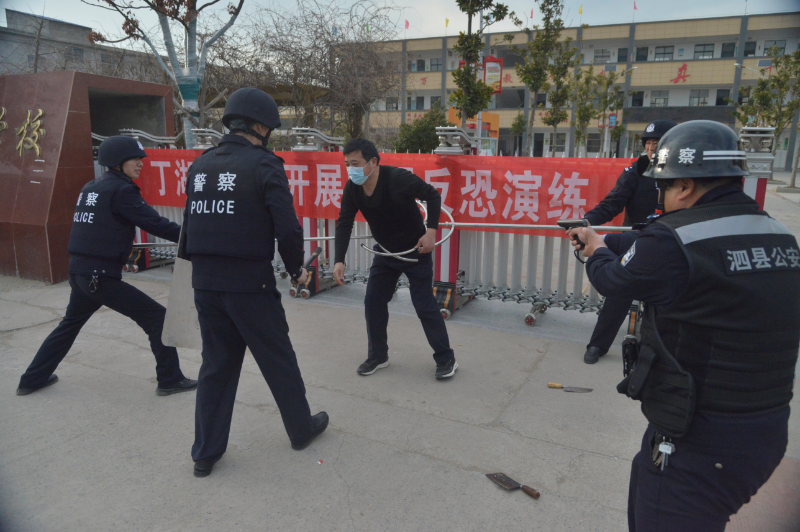 为进一步提高处置校园暴恐事件的能力,2021年3月23日,安徽省泗县公安局丁湖派出所在丁湖中心学校开展反恐防暴演练活动。取得了良好的社会效果,此举受到家长、学校师生一致称赞。