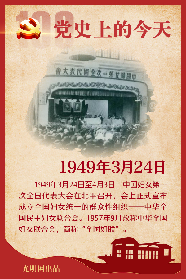 3月24日至4月3日 中国妇女第一次全国代表大会在北平召开,会上正式宣布成立全国妇女统一的群众性组织——中华全国民主妇女联合会。何香凝任名誉主席,蔡畅为主席,邓颖超、李德全、许广平任副主席。1957年9月改称中华全国妇女联合会,简称全国妇联”。