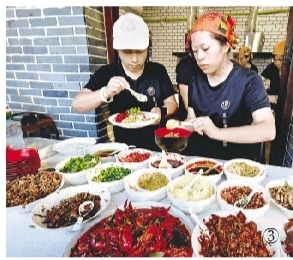 图③:在江西省安义县安义古村群景区水南赣派小吃街,工作人员为顾客配制米粉的佐料。新华社记者 张国俊 摄