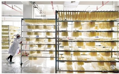 图②:在广西柳州螺蛳粉产业园一家螺蛳粉企业,工人在米粉车间里忙碌。 新华社发(黎寒池 摄)