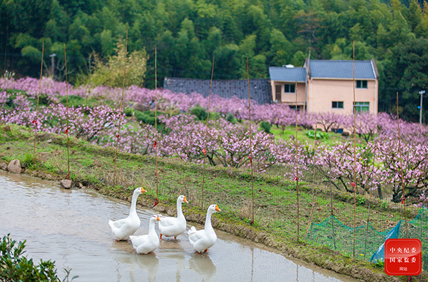 山上层层桃李花,云间烟火是人家。几只白鹅正三三两两悠闲地觅食。(福建省宁德市柘荣县纪委监委供 王志凌 摄)
