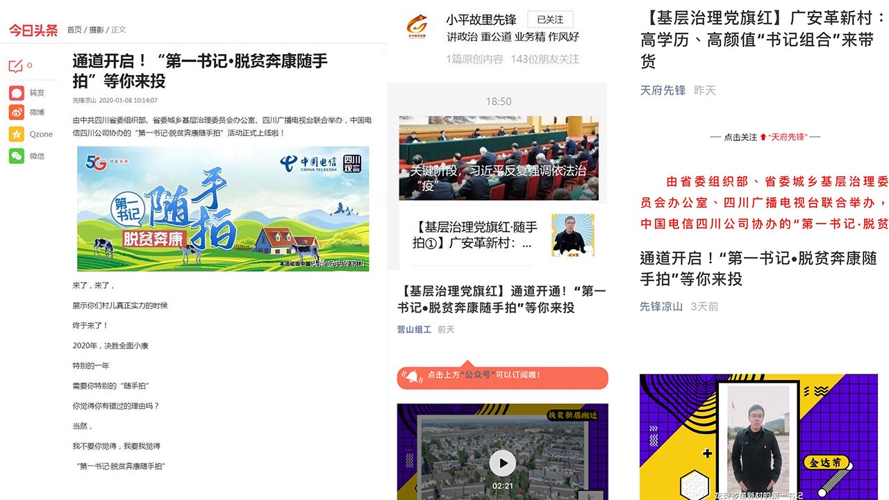 由省委组织部、省委城乡基层治理委员会办公室、四川广播电视台联合举办,中国电信四川公司协办的“第一书记·脱贫奔康随手拍”活动启动以来,火热度蹭蹭上涨,全省各地的组工微信公众号纷纷转载,在IPTV的“大爱四川”专区也可以点播我们的视频。