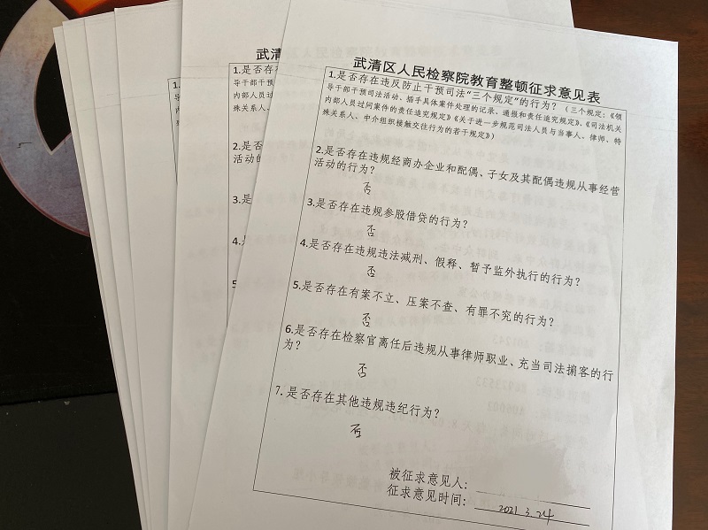 活动最后,检察官向村民代表及两委委员发放了武清区人民检察院教育整顿意见表,广泛听取群众声音,主动接受社会监督,拉近了检群距离,以意见建议促进检察工作提升,为“法治乡村”建设输出优质的检察产品。