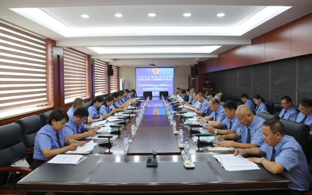 强化“左邻右舍”“上游下游”意识,构建跨区域生态环境“保护共同体”。推进跨区域草原生态、河流生态环境司法保护,2020年9月3日,兴安盟检察分院和吉林省白城市检察院召开建立跨区域草原生态、河流流域生态环境保护协作机制联席会议,共同签订了《关于强化科尔沁草原跨区域生态环境公益诉讼检察协作机制的意见》《关于建立跨区域河流流域生态环境公益诉讼检察协作机制的意见》。两院开展了“两长”巡查草原活动,共同办理了首例外来物种案件,保护生物多样性和草原生态安全。