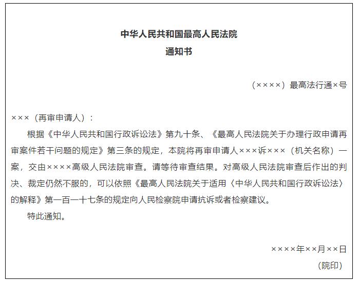 2.中华人民共和国最高人民法院通知书(最高人民法院决定由高级人民法院审查时通知再审申请人用)