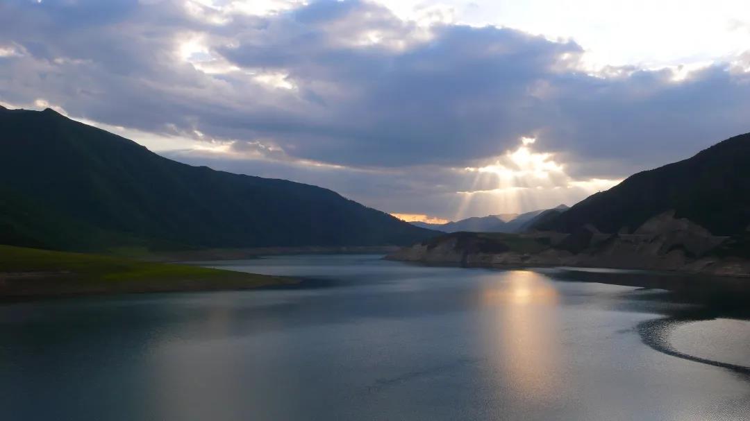 在黑泉水库上游,距离库坝对面约500米处,可鸟瞰水库的壮丽风光。水库沿岸的悠悠青山与头顶的蓝天白云倒映在平静无波的湖面,青山绿水,鸟鸣山幽,晴空万里,美景无边。