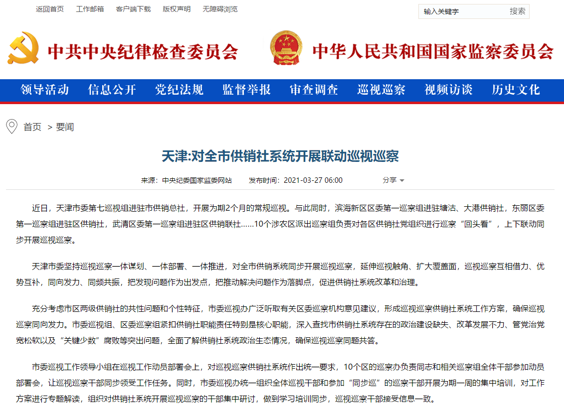 近日,天津市委第七巡视组进驻市供销总社,开展为期2个月的常规巡视。与此同时,滨海新区区委第一巡察组进驻塘沽、大港供销社,东丽区委第一巡察组进驻区供销社,武清区委第一巡察组进驻区供销联社……10个涉农区派出巡察组负责对各区供销社党组织进行巡察“回头看”,上下联动同步开展巡视巡察。
