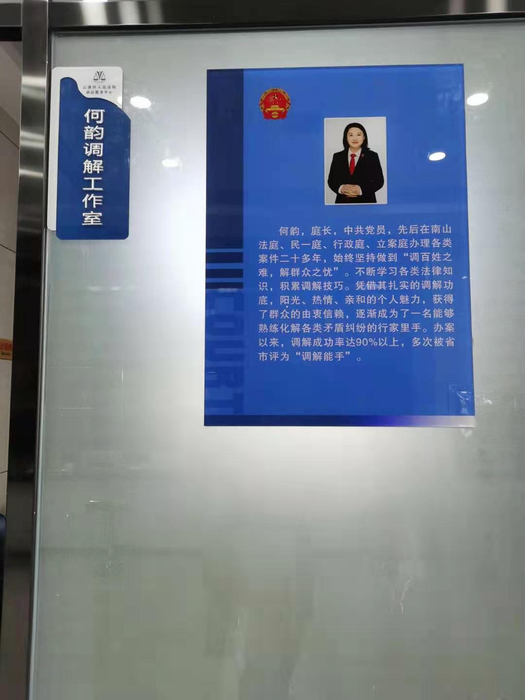 何韵调解工作室是云溪法院首个以个人名义命名的调解室。何韵,中共党员,先后在南山法庭、民一庭、行政庭、立案庭办理各类案件二十多年,始终坚持做到“调百姓之难,解群众之忧”。不断学习各类法律知识,积累调解技巧。凭借其扎实的调解功底,阳光、热情、亲和的个人魅力,获得了群众的由衷信赖,逐渐成为了一名能够熟练化解各类矛盾纠纷的行家里手。办案以来,调解成功率达90%以上,多次被省市评为“调解能手”。