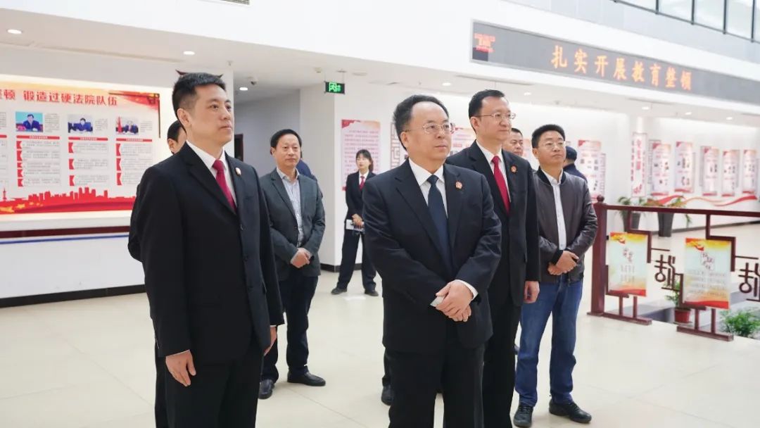 王树江院长先后察看达川区法院队伍教育整顿专题展板、党支部学习教育展区、廉政文化阵地、执行局党支部党建室、法治文化广场等功能阵地,并了解开展政治轮训及党组书记上党课情况。