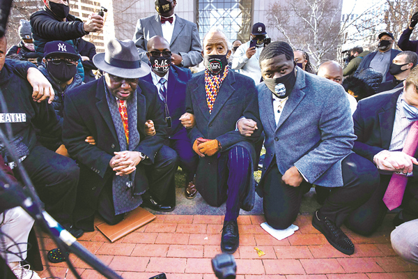 庭审开始前,死者家属和律师在明尼阿波利斯当地法庭外以跪姿向死者乔治·弗洛伊德致哀。